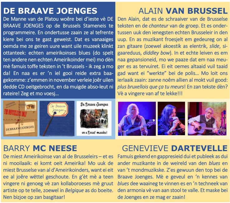 Wad ès da vè een biest, den Brusselsen blues ? Mais qu’est donc le blues bruxellois ? Brusselse blues, wat voor een beest is dat ? Quand De Manne van de Platou présententDe Braave Joenges en et Braaf Maske De Braave Joenges jouent partout dans le monde … et même ailleurs !De Braave Joenges treden overal ter wereld en elders op !De Braave Joenges speïlen euveral in de weïrelt … en op ander plochen uuk ! Contact us
